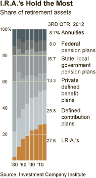 There is more money in I.R.A.’s than in any other type of retirement vehicle, according to estimates from the Investment Company Institute. I.R.A. balances totaled $5.3 trillion at the end of the third quarter of 2012. That’s more than the $5 trillion in 401(k), 403(b) and other similar plans; the $4.8 trillion in government retirement plans; and the $2.6 trillion in traditional pensions.