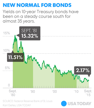 For context on just how low interest rates are, bond yields are currently “lower than 97% of history,” says Charlie Bilello, director of research for asset management firm Pension Partners. For instance, right now 10-year U.S. Treasury bonds yield less than 2.2% — which adds up to just $220 in a year’s return from a $10,000 investment. That’s down from about 5% yields right before the Great Recession, and yields on the 10-year that regularly approached 7% across the 1990s.