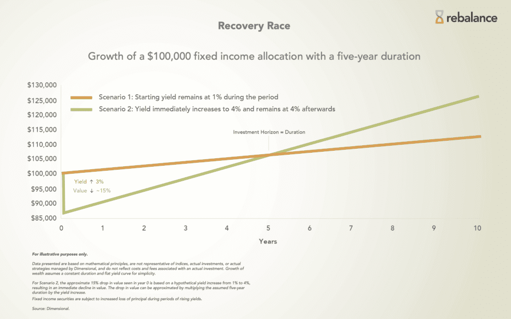However, the silver lining to the bond story is that interest payments and bonds reaching maturity can now be reinvested at higher interest rates. Generally speaking, it is actually a good thing for long-term bond investors that interest rates have gone up. The chart below shows a hypothetical situation of how rising rates initially hurt a bond portfolio, but ended up helping it to do better than if rates had stayed low.