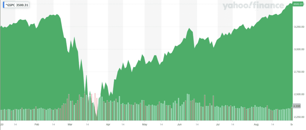 Of course, COVID-19 had not gone away, but investors accounted for new information as it came in and, in general, decided that stocks were worth buying and holding. Just like with many other things the U.S. experienced with COVID, this drastic selloff and relatively quick recovery probably did not feel “normal”. The graphic below shows the index during the first eight months of 2020 (source: Yahoo Finance).