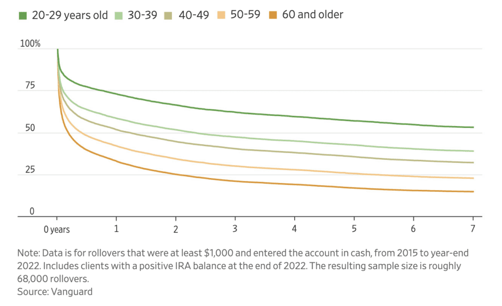 Vanguard customers who rolled money over to an IRA in their 20s held cash in those accounts for a median of seven years, compared with five months for investors who rolled over to an IRA at around age 55.