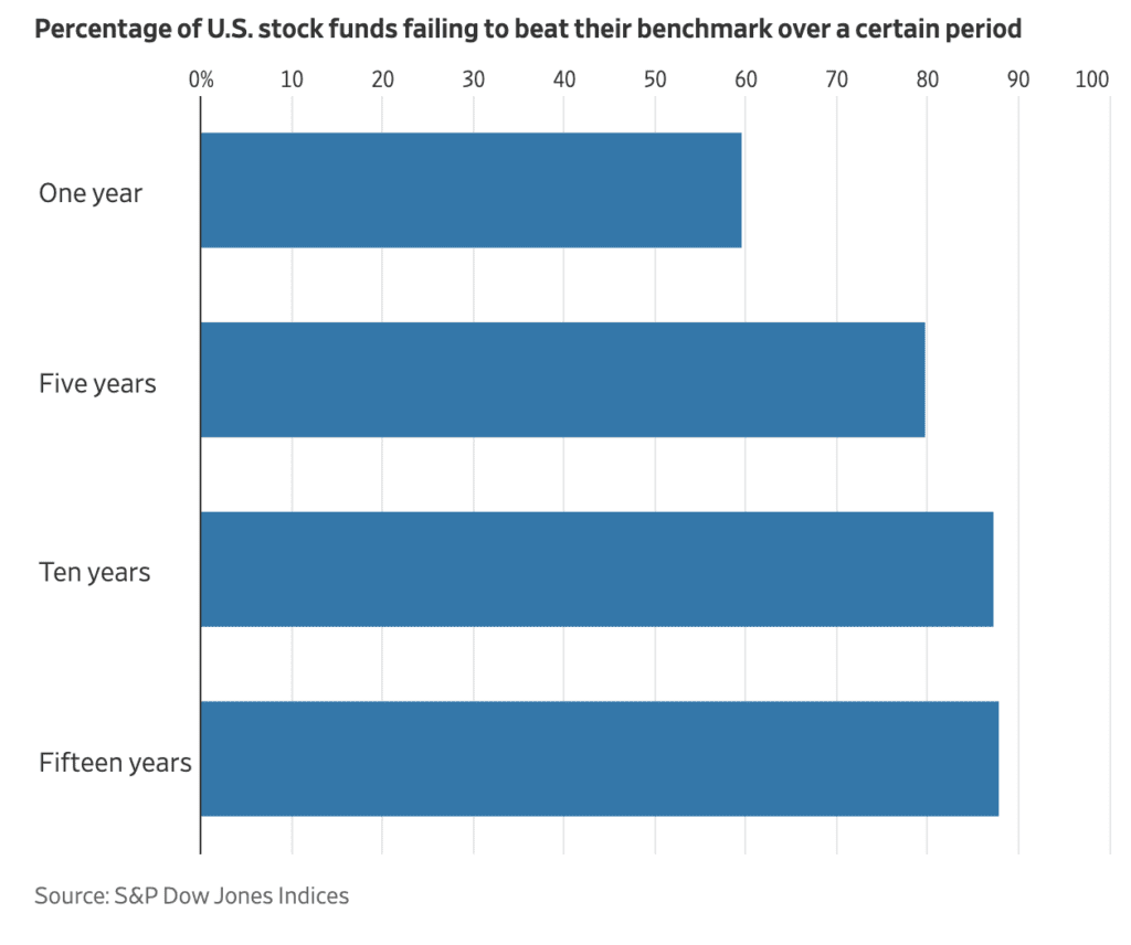 But even a vanilla index fund that costs very little contains those needles in a haystack. Trusting fund managers to find and then keep owning them might result in frustration. S&P Dow Jones Indices shows that outperforming mutual funds in one period have very poor odds of following up. In 2020, for example, only 43% of U.S. stock mutual funds beat their index. Of that group, only 2.5% kept it going for the next two years.