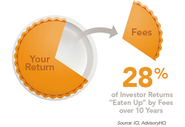 Unfortunately, interest isn’t the only thing that compounds over time. Fees compound too. Think about it. Just as adding money to your investments can quickly grow your total savings, money that is removed from your savings — by annual fees for example — will compound over time and end up dramatically eating away at your savings. Even a seemingly small annual fee such as 1.49%, the average U.S. advisory fee + average U.S. mutual fund fee, can take away almost 30% of your investment return when compounded over 10 years. We know. It’s shocking.